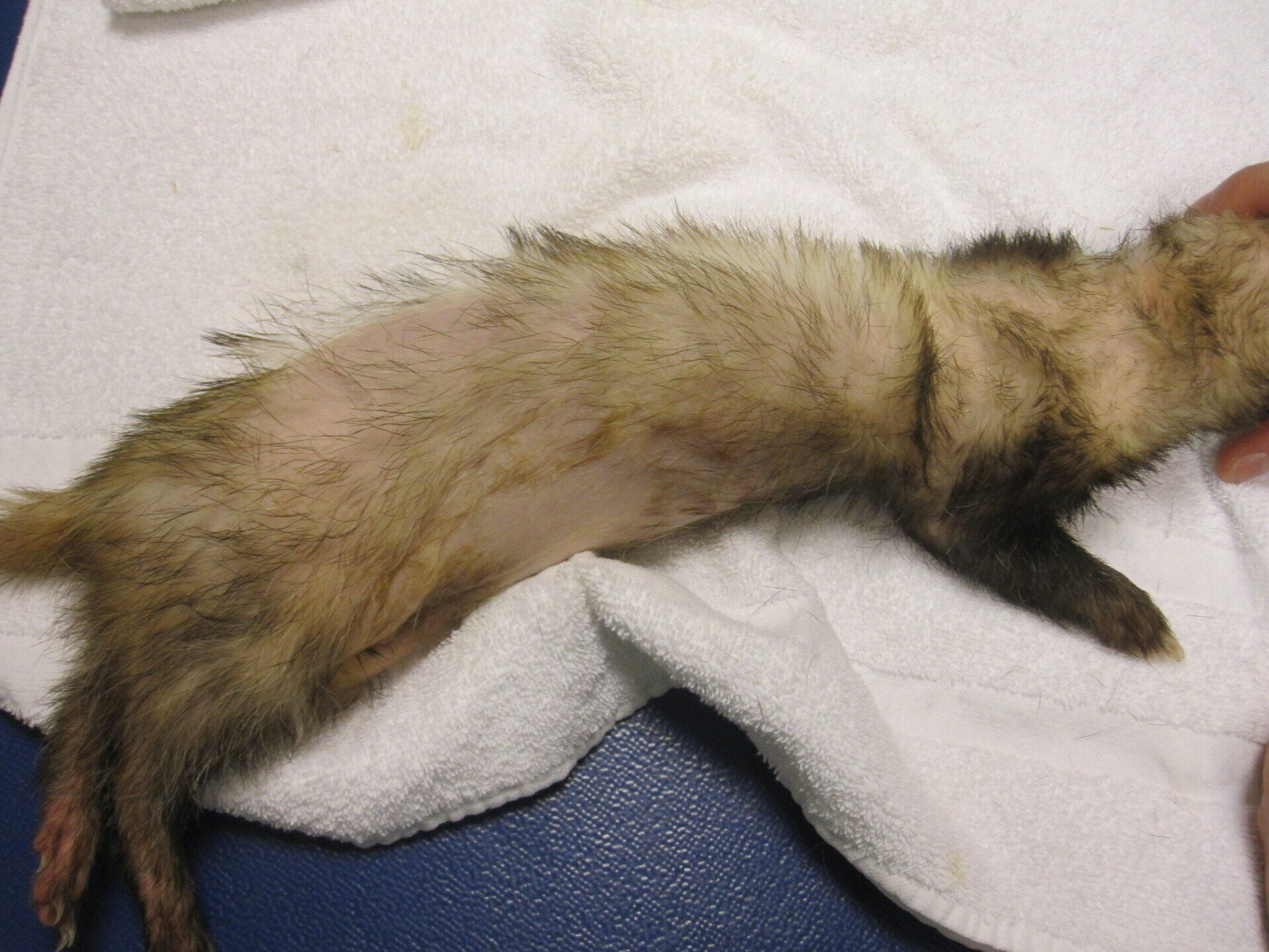 Les furets sont une espèce particulière car la stérilisation chirurgicale (ou castration) provoque, chez un eux, un déséquilibre hormonal. Ce déséquilibre conduit à une transformation tumorale des glandes surrénales, sous l'effet des hormones de l'hypopohyse, entre 3 et 5 ans après la stérilisation chirurgicale. Lors de stérilisation chimique, ce risque est nettement plus faible. Les signes cliniques de la maladie surrénalienne chez le furet se manifestent par une perte importante de poils (avec une queue dite en queue de rat), des démangeaisons, une perte de poids, parfois des difficultés à uriner ou un oedème de la vulve chez la femelle. La maladie surrénalienne semble également prédisposer à l'insulinome et à d'autres troubles pathologiques.