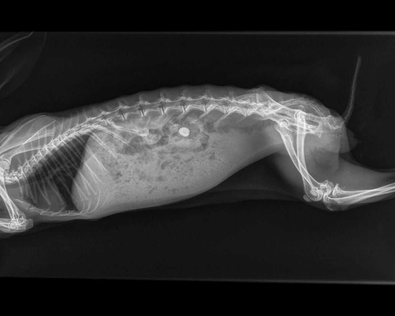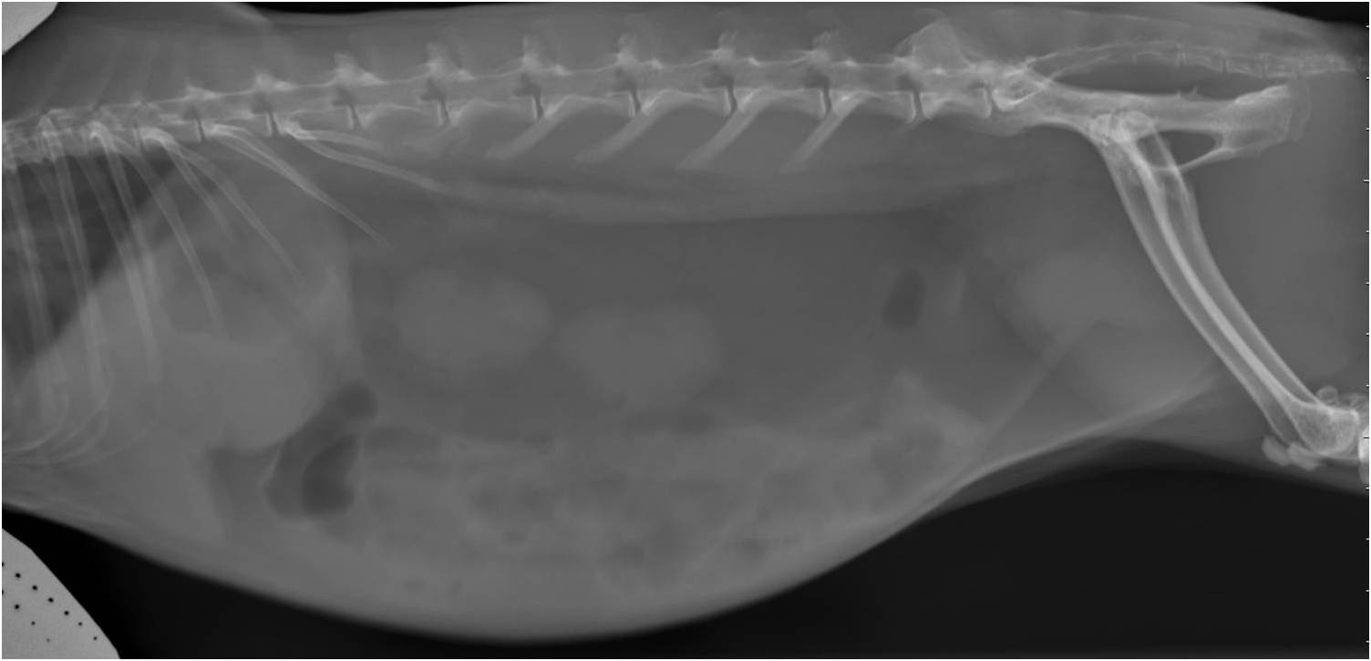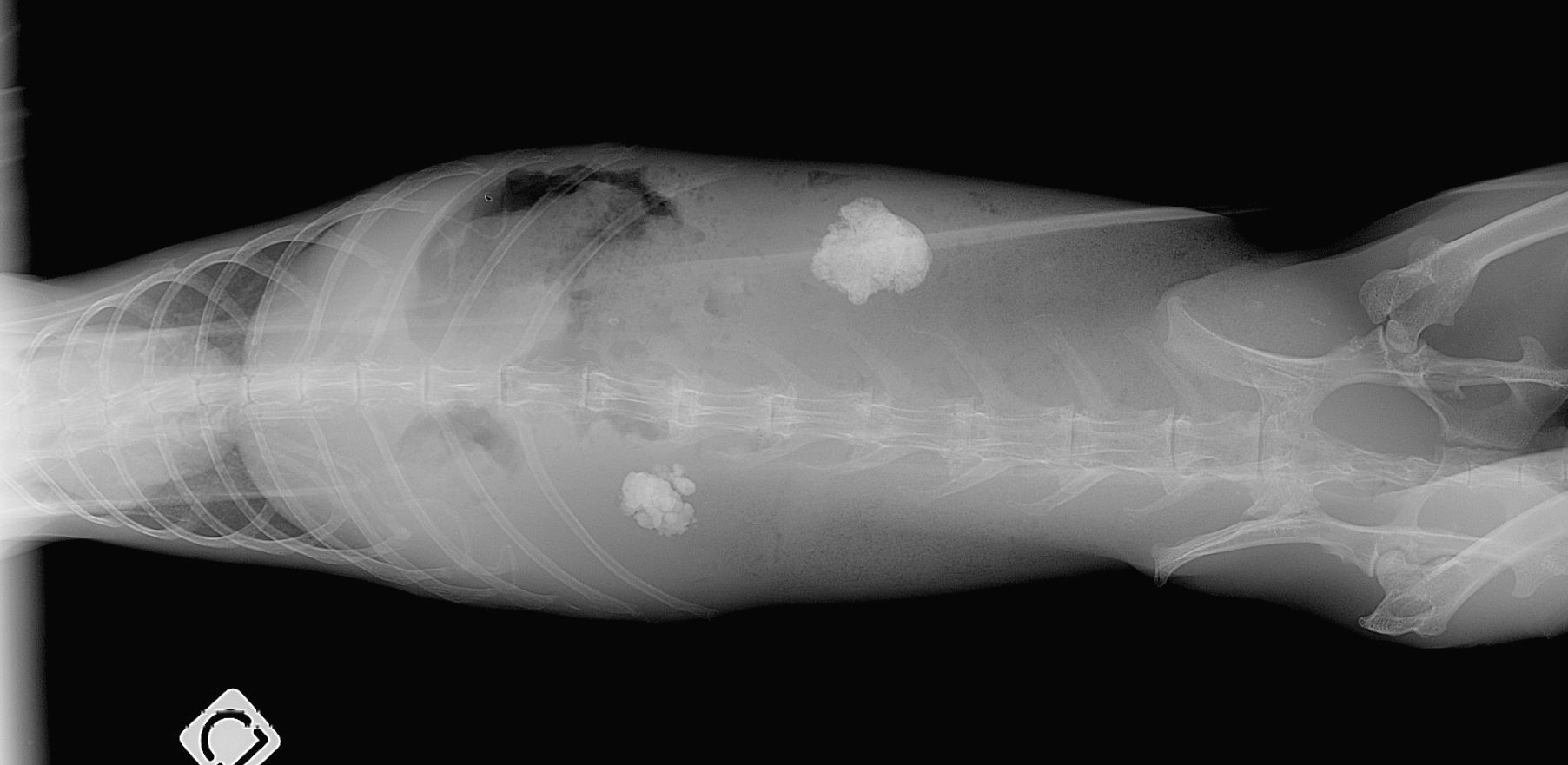 Une infection par E.cuniculi peut éventuellement prédisposer à la formation de calculs. Les calculs rénaux se voient généralement à la radiographie mais certains calculs ne peuvent être visualisés que par échographie.
