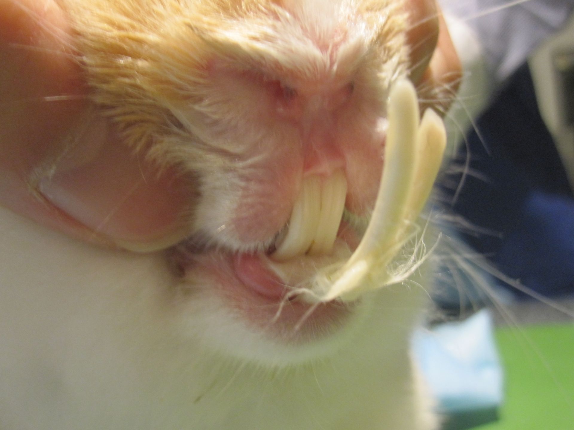 Les dents des lapins et des rongeurs herbivores poussent en continue. Par conséquent, elles continuent à croitre toute la vie de l'animal. Parfois, ces dents sont mal alignées et peuvent empêcher plus ou moins sévèrement la mastication, ce qui se traduit par de l'anorexie (refus de manger) chez un lapin ou un cobaye. Cette maladie dentaire est appelée malocclusion dentaire. La malocclusion dentaire est particulièrement fréquente chez les lapins, cobayes et chinchillas. Elle est liée en priorité à un défaut d'usure des dents (manque de foin) et généralement à une surconsommation de granulés. Par ailleurs, des facteurs génétiques et/ou des carences en vitamines (notamment en vitamine C chez le cobaye) sont également mis en cause.