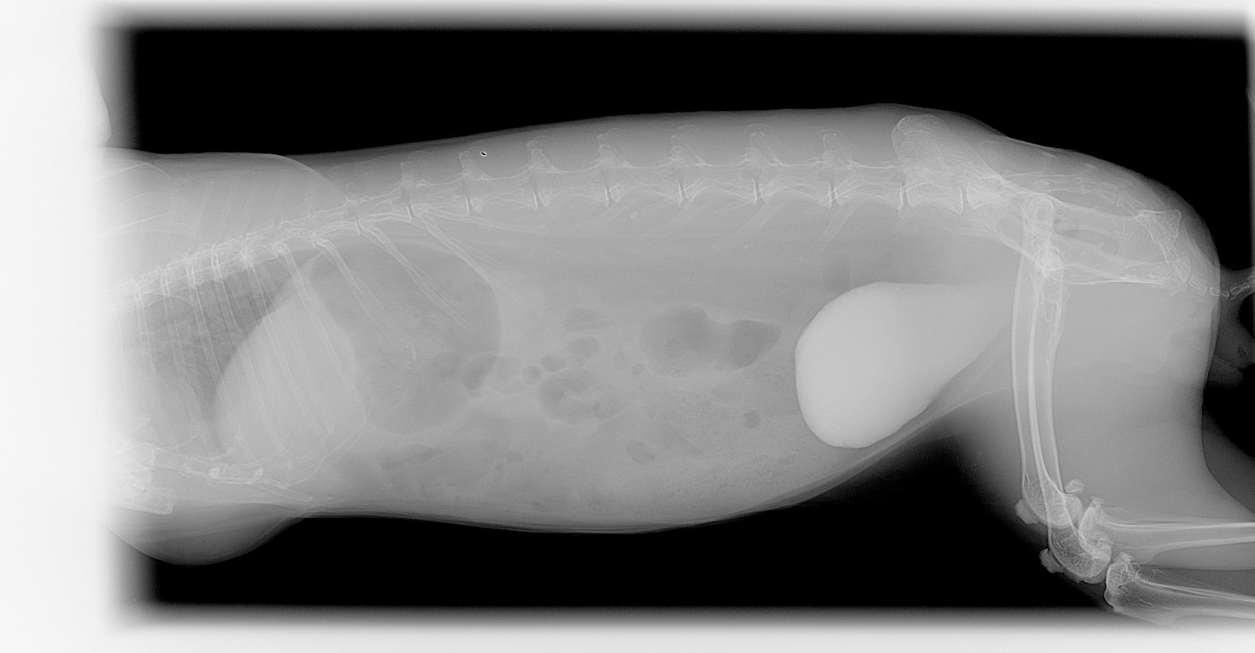 Le diagnostic se fait par radiographie mais une échographie et une prise de sang sont recommandés pour exclure la présence d'autres calculs au niveau des uretères et des reins et aussi pour vérifier l'absence d'insuffisance rénale. Le traitement est quasiment toujours chirurgical, certains cas particulier peuvent être traité par endoscopie ou par traitement médical.