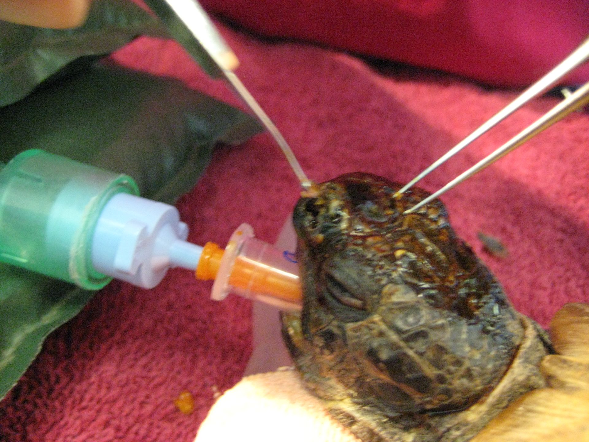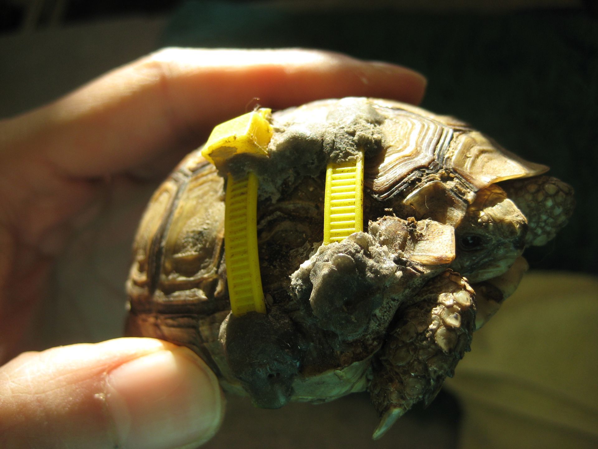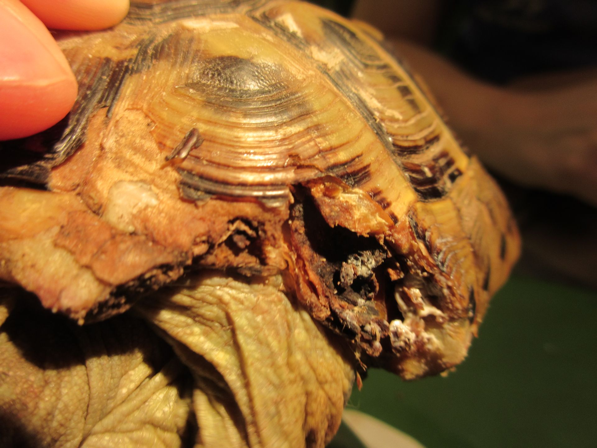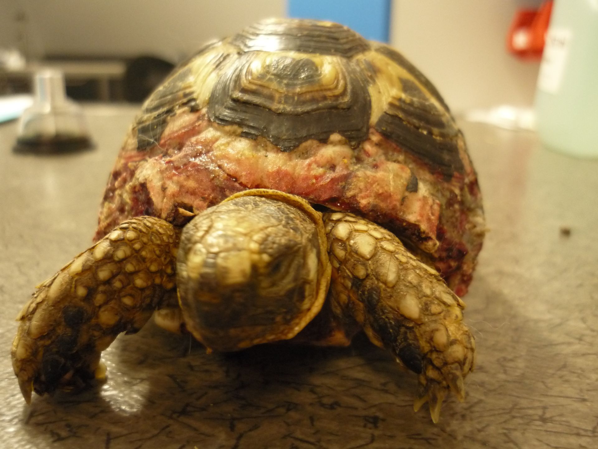 Les fractures de la carapace chez les tortues sont des incidents fréquents de tondeuse. Elles doivent être traitées en urgence. Le but premier est de soulager la douleur et d'éviter que des particules de terre rentre dans la plaie.