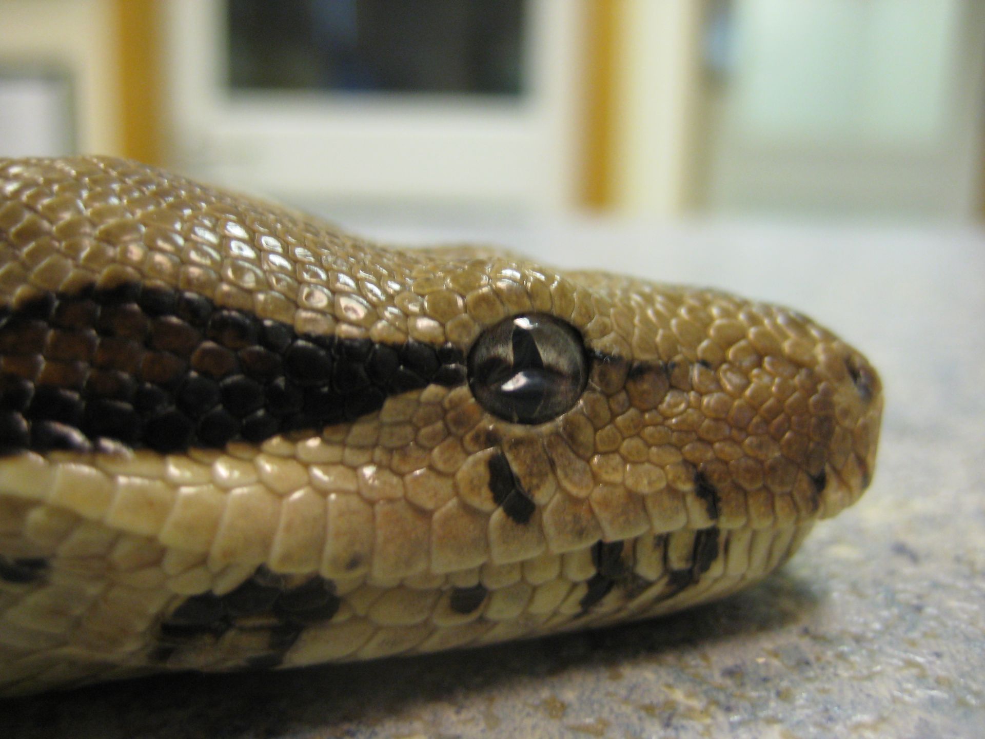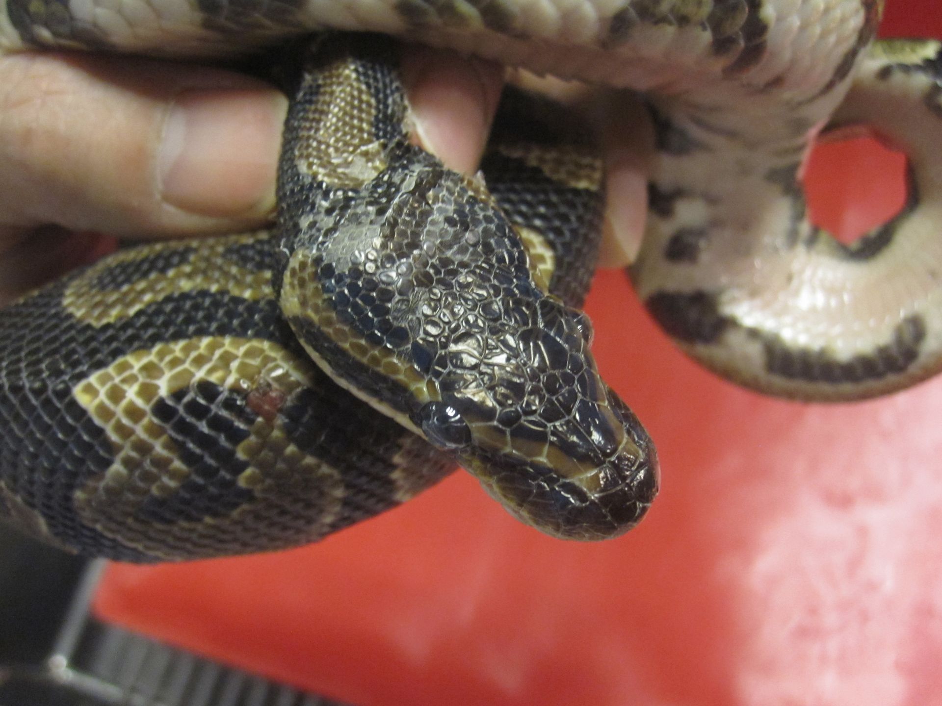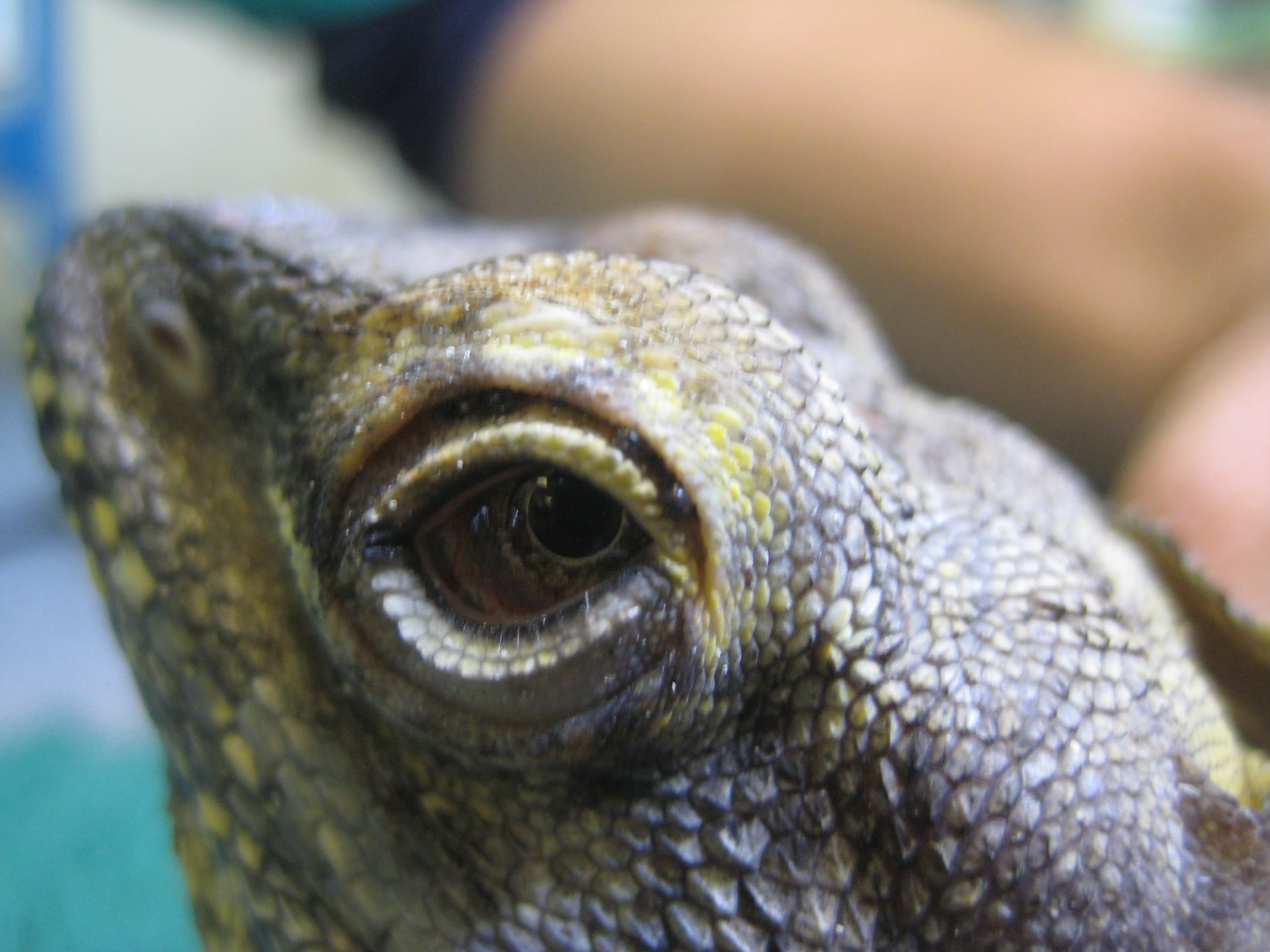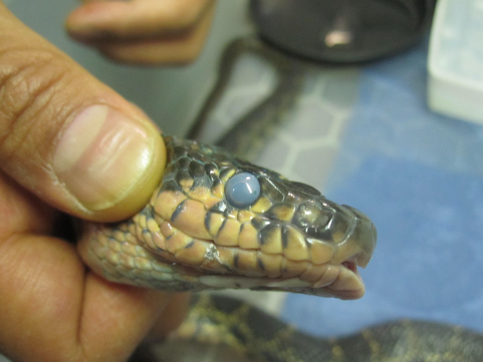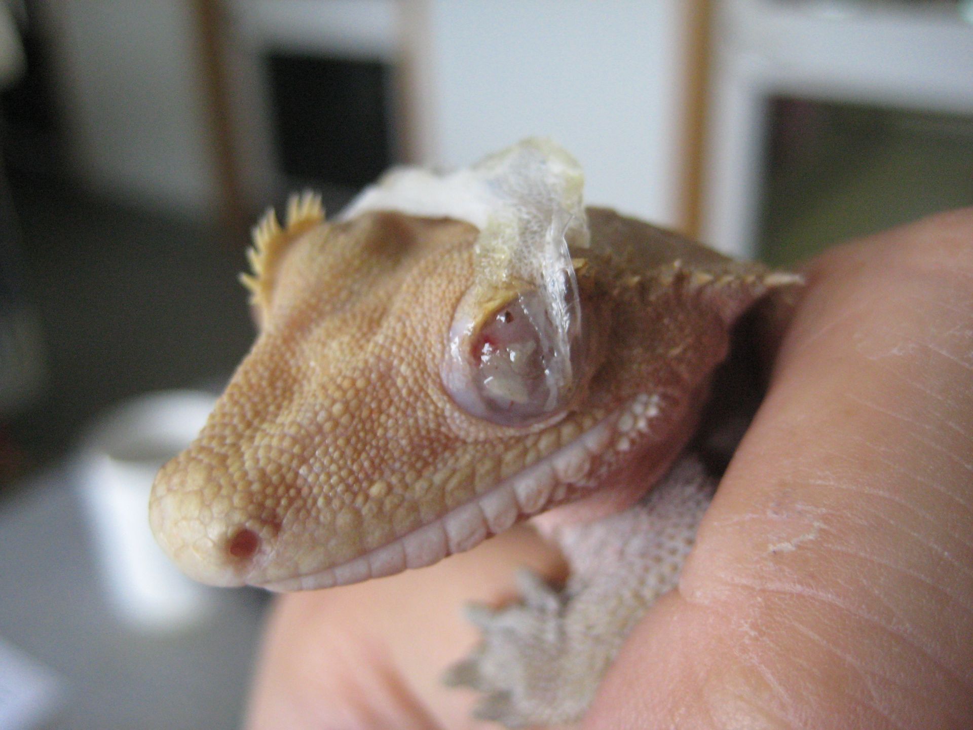 Lors de la mue, il peut arriver que l'ancienne peau soit adhérente au niveau de l'oeil. C'est ce que l'on appelle une rétention de la lunette pré-cornéenne. Il faut être très délicat dans cette situation sous peine de léser l'oeil qui est en dessous. Il faut être délicat et humidifier l'ancienne peau (exuvie) au maximum. En cas de doute, la consultation d'un vétérinaire est fortement recommandée.